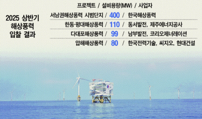 공공주도 해상풍력 첫발…한전ㆍ동서ㆍ남부발전 등 낙찰 (대한경제, 9월 2일) 공공이 주도하는 해상풍력 프로젝트 개발사업이 본격적으로 닻을 올렸다. 2일 관련업계에 따르면 최근 발표된 ‘2025 상반기 해상풍력 경쟁입찰’ 결과 공공주도형 입찰에 참여한 4개 프로젝트, 총 689㎿ 규모의 사업이 모두 낙찰됐다. 이번에 선정된 프로젝트는 △서남권해상풍력 시범단지(400㎿, 한국해상풍력㈜) △한동ㆍ평대해상풍력(110㎿, 동서발전ㆍ제주에너지공사) △다대포해상풍력(99㎿, 남부발전ㆍ코리오제너레이션) △압해해상풍력(80㎿, 한국전력기술ㆍ씨지오ㆍ현대건설) 등이다.