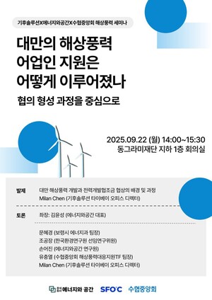 해상풍력 이익공유 방안, 해외 사례서 찾는다 (에너지신문, 9월 16일) (주)에너지와공간은 오는 22일 기후솔루션, 수협중앙회와 함께 '대만의 해상풍력 어업인 지원은 어떻게 이루어졌나-협의 형성 과정을 중심으로' 세미나를 개최한다. 지난 3월 공포된 해상풍력 보급 촉진 및 산업 육성에 관한 특별법으로 주민참여 및 이익공유 제도의 변화가 예상되는 가운데, 이번 세미나를 통해 국내 해상풍력 산업의 이해관계자들이 함께 논의할 예정이다. 세미나는 서울 종로구 동그라미재단에서 공개적으로 진행되며, 순차통역이 제공된다. 이번 세미나는 국내 해상풍력 산업이 나아갈 다음 단계를 구체적으로 설계할 수 있는 계기가 될 것으로 기대된다.